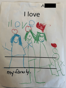 “I love my family”. Drawing by A.P., a four year old who was separated from her dad for almost eight months.